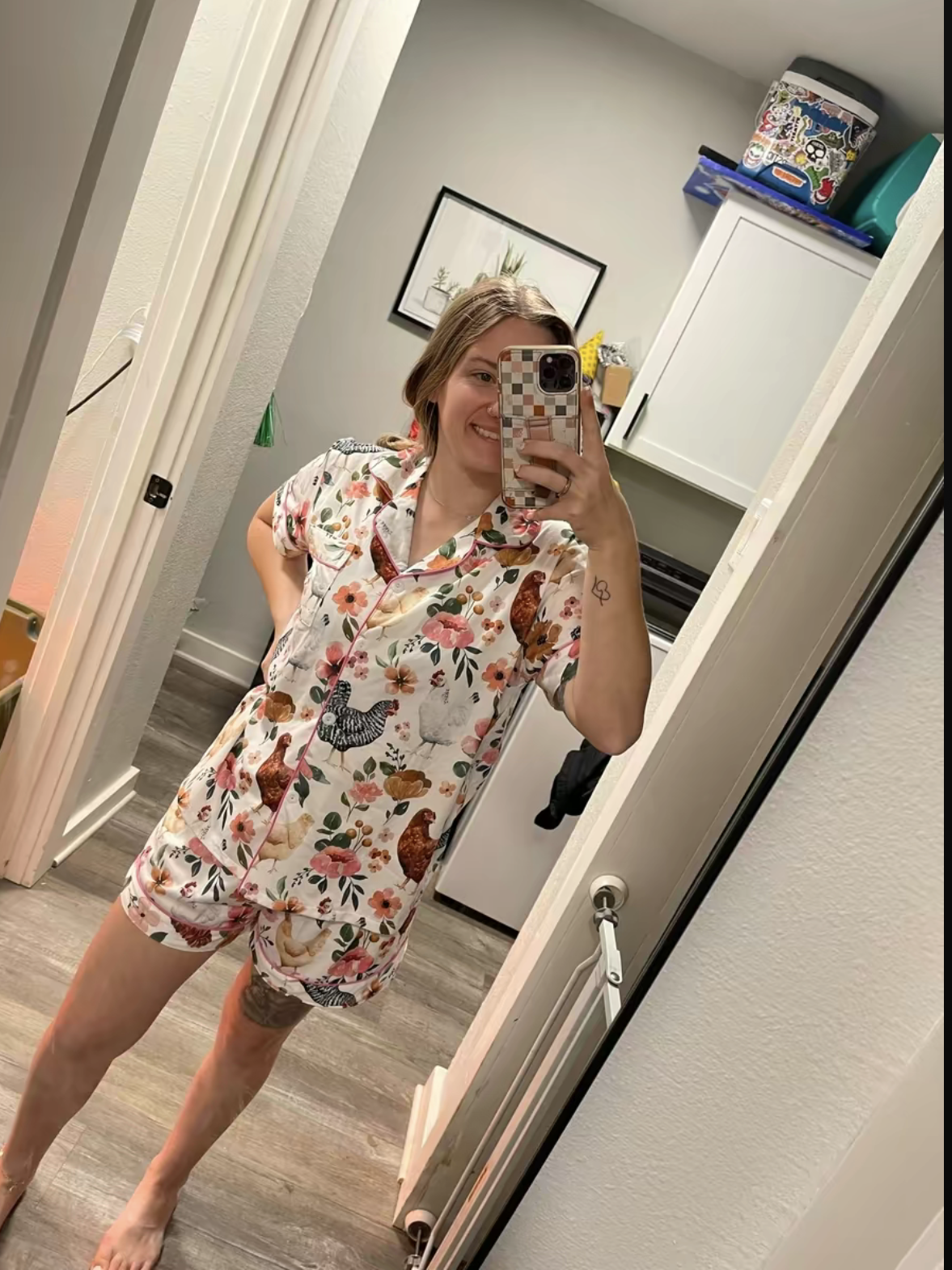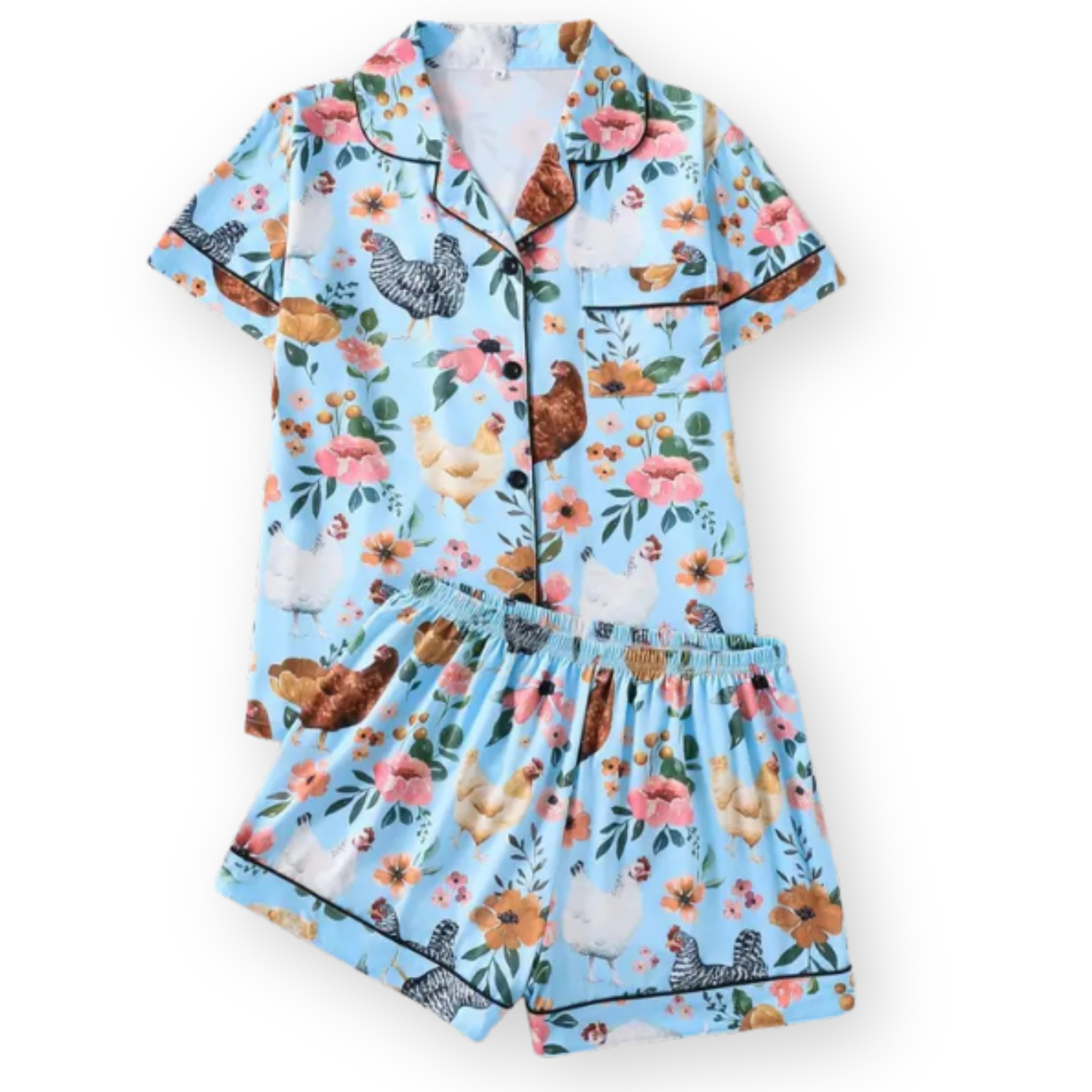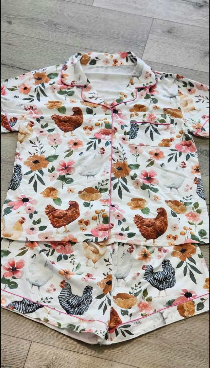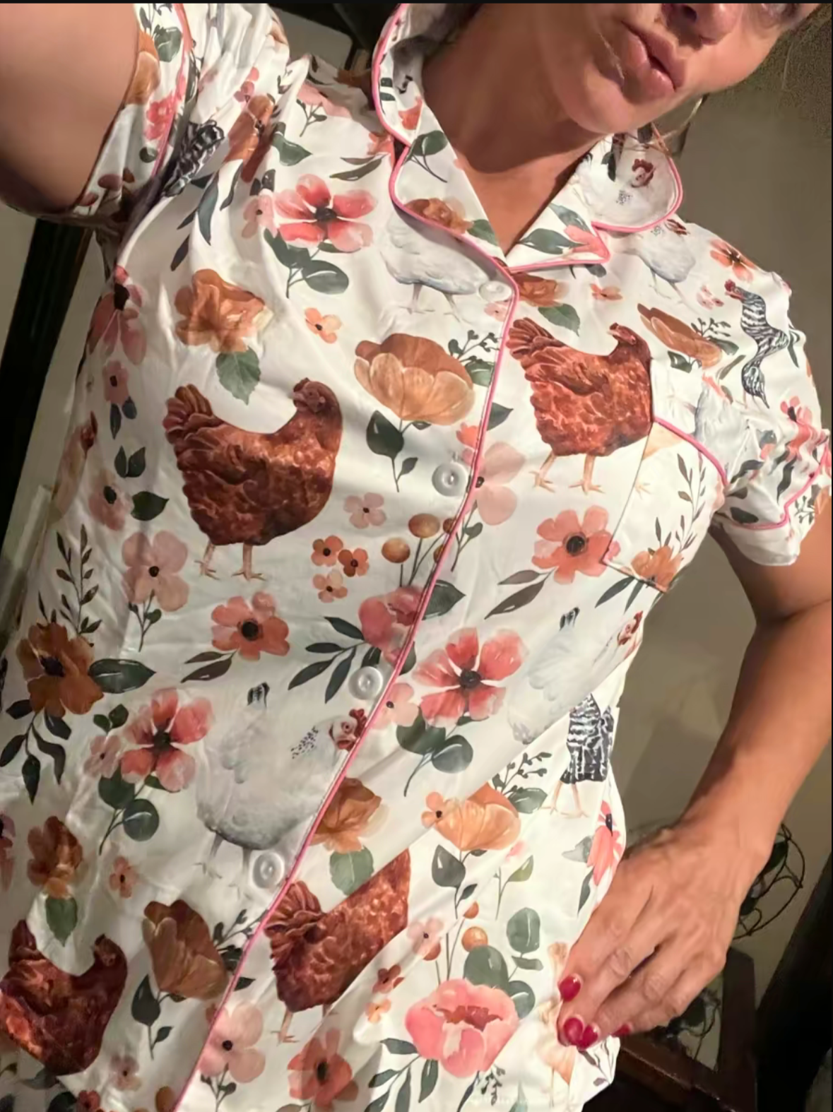 Featuring a cheerful hen print, ultra-soft fabric, and a flattering relaxed fit — these are made for cozy nights, lazy Sundays, and spontaneous selfies with your chickens.