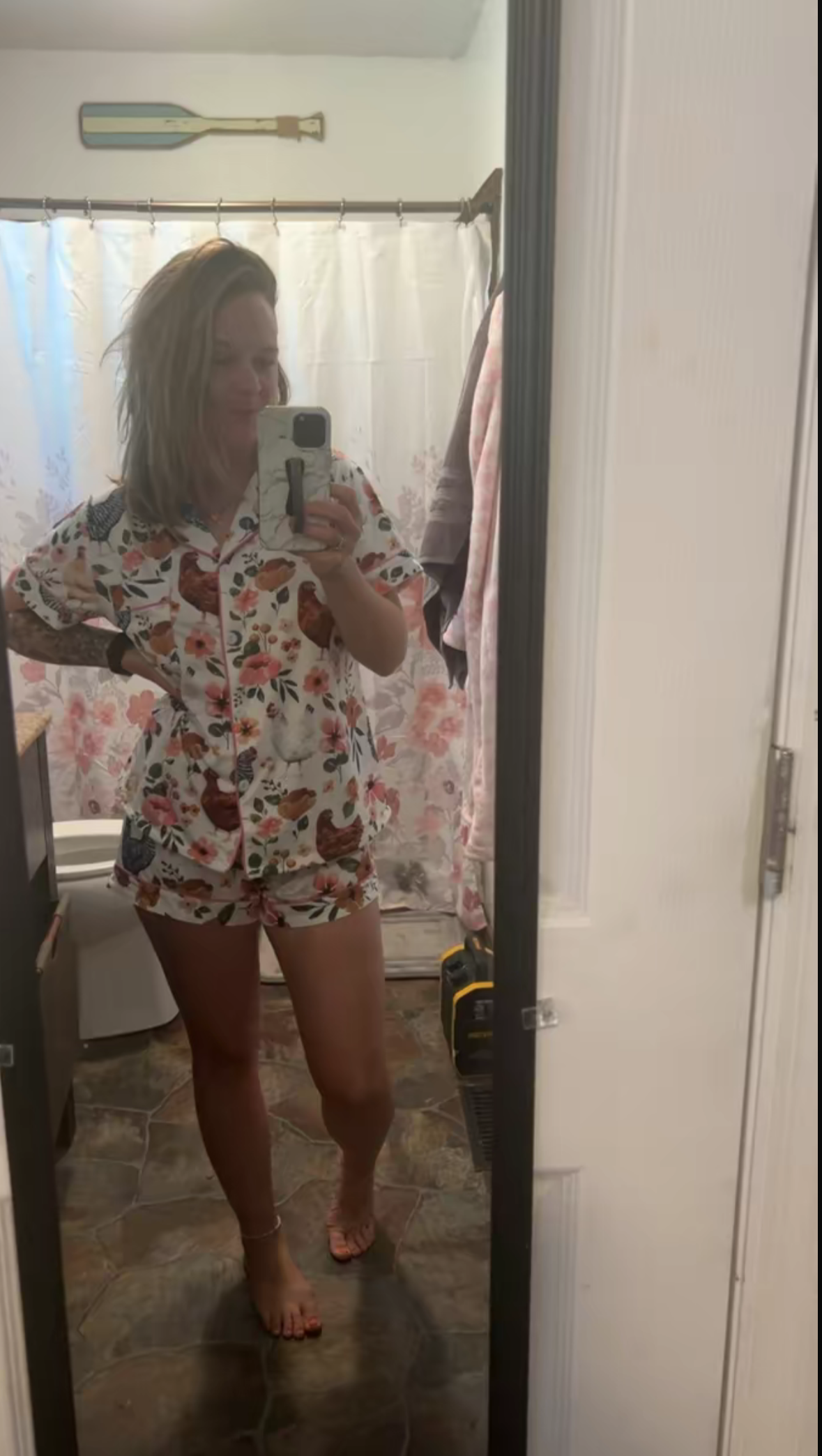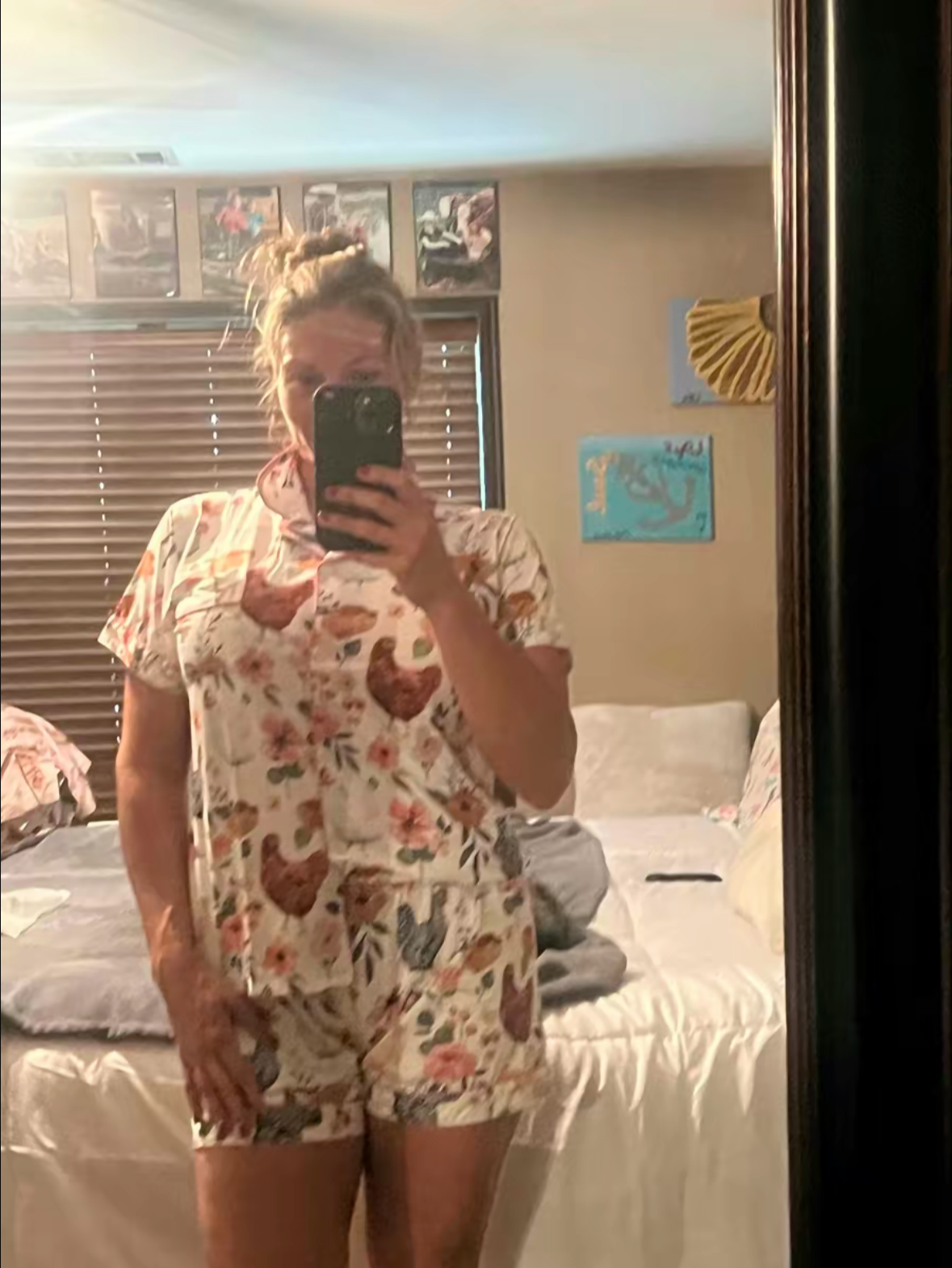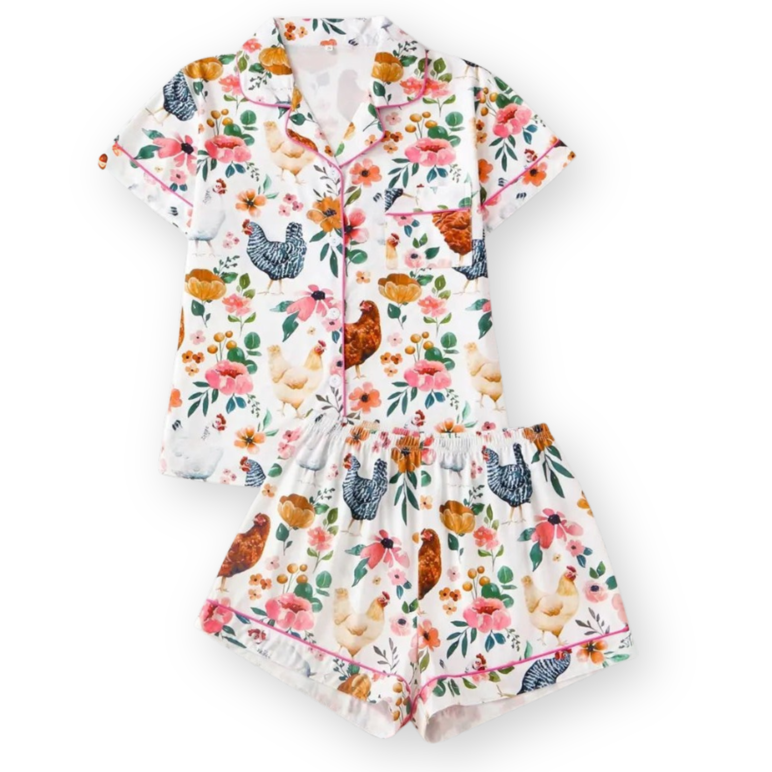Featuring a cheerful hen print, ultra-soft fabric, and a flattering relaxed fit — these are made for cozy nights, lazy Sundays, and spontaneous selfies with your chickens.