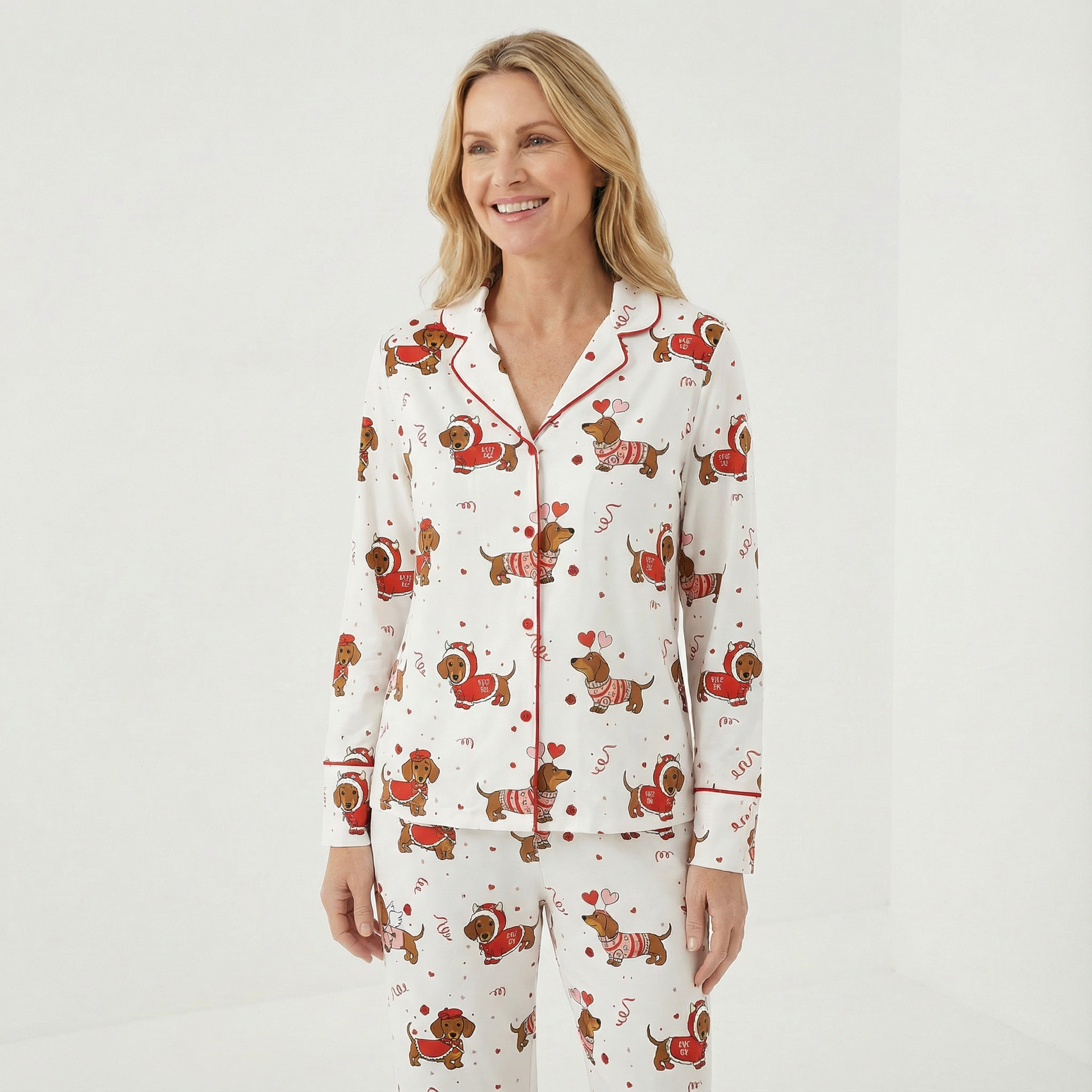 The Valentine's Day Dachshund Pajama Set celebrates the kind of love that's long, loyal, and a little bit stubborn. Featuring adorable dachshunds dressed in cozy Valentine's sweaters and scarves against a crisp white background with scattered hearts and confetti, this charming print is for anyone who knows that wiener dogs are the perfect valentines. Made with our buttery soft silk blend that's almost as snuggly as your actual dachshund (but takes up way less bed space).